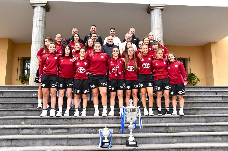 En el acto, en el que también estuvo presente el concejal de Deportes, Juan Jesús del Rosario, las jugadoras de la UD Tenerife El Rosario Egatesa C exhibieron los trofeos de la Copa María José Pérez y de la Liga de Tercera RFEF, conseguidas días atrás. Además, el primer edil Escolástico Gil regaló al club un ejemplar del libro sobre el patrimonio del Municipio “El Rosario. Una mirada a sus hallazgos científicos”.